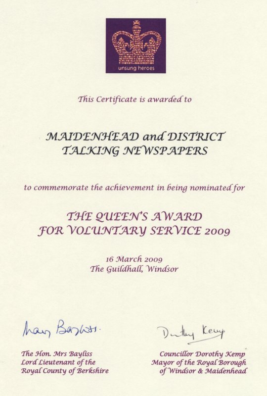 (left) This certificate was presented to the Association by the Lord Lieutenant of Berkshire at Windsor