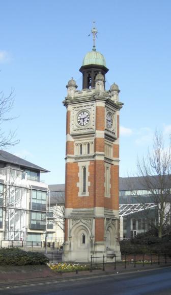 Maidenhead Clock Tower, seen from Station Approach on a summer evening in 2004, and from the other side on